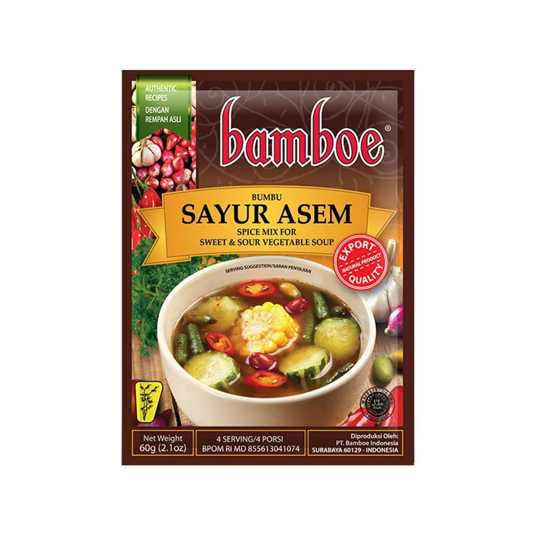 Bamboe Sayur Asem is sour vegetable seasoning paste from Bamboe, a renowned Indonesian instant spice since 1968 that crafted using selection of high-quality natural ingredients, and resulting in a delightful taste that is pleasing to the palate. Sayur Asem is a popular Indonesian tamarind-based vegetable soup with refreshing-sour flavors. Grab this Indonesian instant seasoning for your Indonesian dish creation with Bamboe!
