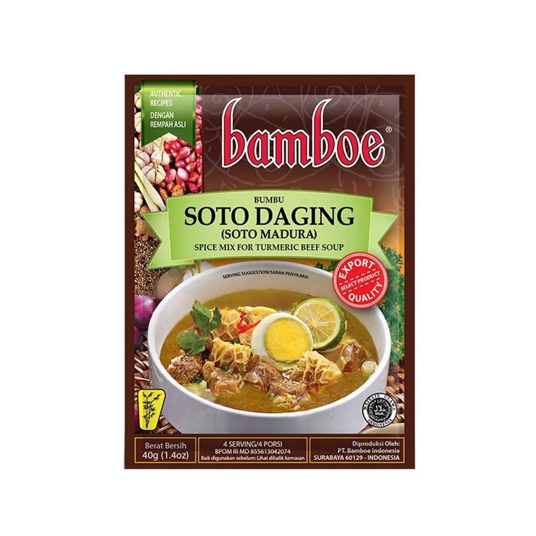 Bamboe Soto Madura or Bamboe Soto Daging (Soto Madura) is East Javanese soup seasoning paste from Bamboe, a renowned Indonesian instant spice since 1968 that crafted using selection of high-quality natural ingredients, and resulting in a delightful taste that is pleasing to the palate. Soto Madura is East Javanese dish, known for its savory broth, featuring beef or or chicken, vermicelli noodles, and a mix of herbs and condiments. Grab this Indonesian instant seasoning for your Indonesian dish creation with Bamboe!