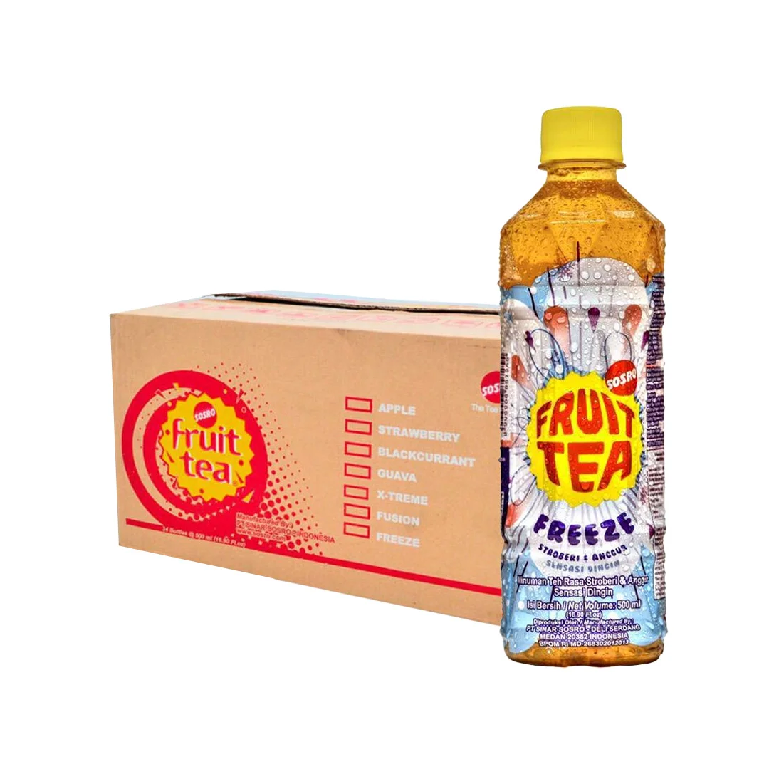 Fruit Tea Freeze, a refreshing fruit-flavored tea beverage crafted with strawberry and grape flavored with a cold sensation. Made with selected tea leaves and fruit juice. A practical tea drink to quench your thirst and refresh your day. This Indonesian tea comes in 500ml PET bottle.