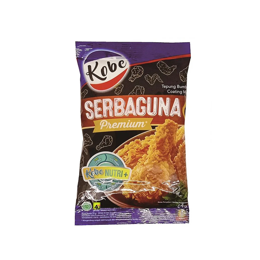 Kobe Tepung Bumbu Serbaguna Special is a nutritious seasoning flour that is free from MSG and fortified with vitamins. Made with selected spices and a distinct garlic aroma, it adds flavor and crispiness to fried foods. This versatile flour is ideal for frying a variety of dishes, including chicken, tempeh, seafood, and tofu. This comes in 70gr package.