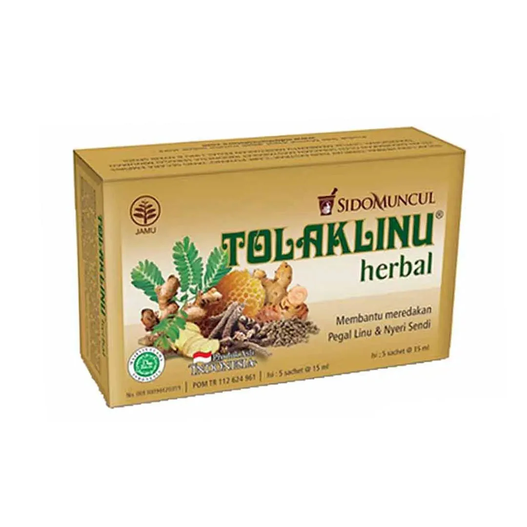 Sido Muncul Tolak Linu Herbal is an Indonesian herbal remedy used to help relieve muscle aches and joint pain. Take 1-2 sachets before bed and 1-2 sachets after physical activity or exercise. It can be consumed directly from the sachet or mixed with 50 ml of water. This comes in 5x15ml.