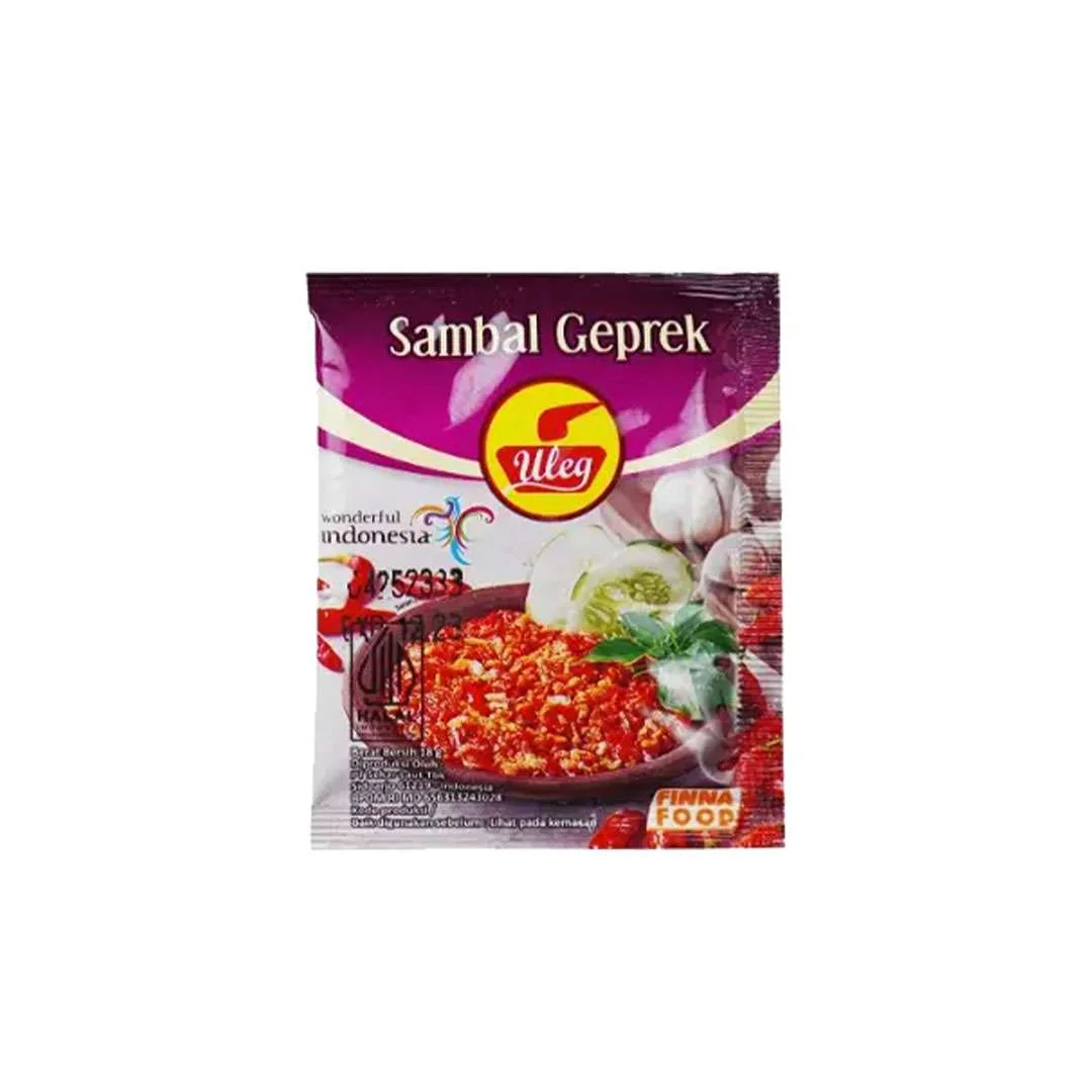 Uleg Sambal Geprek (Smashed / Geprek Chili Sauce) is grind-homemade chili sauce made from selected fresh chilies, blended with garlic, and spices. It can enhance the flavor of your fried chicken dish or any fried dish. This Indonesian sambal (or chili sauce) comes with in pocket size sachet package that’s easy to bring anywhere.