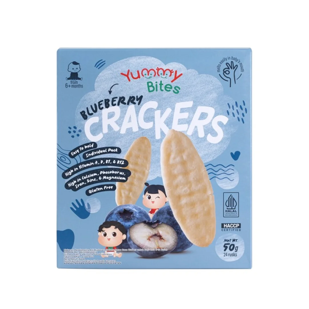 Yummy Bites Rice Crackers Blueberry are made from premium organic Japonica rice and natural ingredients with blueberry flavor. They are free from gluten, eggs, nuts, and any artificial additives. Ideal as an early snack for complementary feeding, they help babies transition to solid foods and support teeth development. Suitable for ages 6 months and up, each pack weighs 50gr.